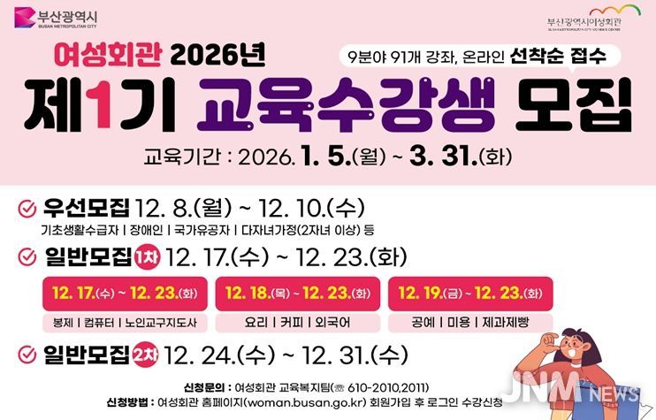 제이앤엠뉴스 | 부산시 여성회관은 내일(8일)부터 '2026년 제1기 교육과정' 수강생을 모집한다고 밝혔다.