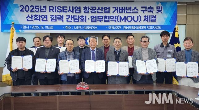 제이앤엠뉴스 | 경남도립남해대학(총장 노영식)은 19일 오전 10시 30분, 사천시 상공회의소 3층 회의실에서 지역 항공산업의 지속 가능한 성장과 경쟁력 강화를 위해 ‘2025 RISE·글로컬대학사업 성과 확산을 위한 항공산업 지·산·학 협력 거버넌스 구축 및 업무협약(MOU) 체결식’을 개최했다.