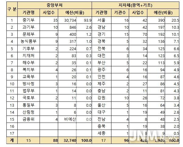 지방자치단체(광역 17개, 기초 79개)는 서울(390억원), 경남(197억원), 경기(192억원) 등에서 총 1,905억원, 420개 사업을 추진할 계획이다.