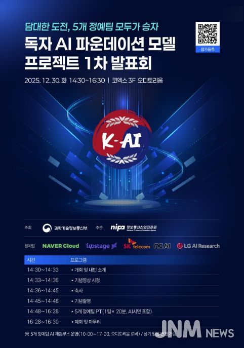 제이앤엠뉴스 | 과학기술정보통신부와 정보통신산업진흥원(원장 박윤규)은 오는 12월 30일 14:30, 코엑스 오디토리움에서, 「독자 AI 파운데이션 모델」 프로젝트 1차 발표회를 개최한다.