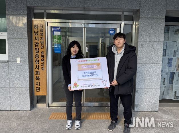 제이앤엠뉴스 | 감일퍼스트태권도장(관장 이양성)은 지난 12월 26일 하남시감일종합사회복지관(사회복지법인 휴먼복지회 운영)에 ‘사랑의 라면트리’ 라면 117개를 전달했다.