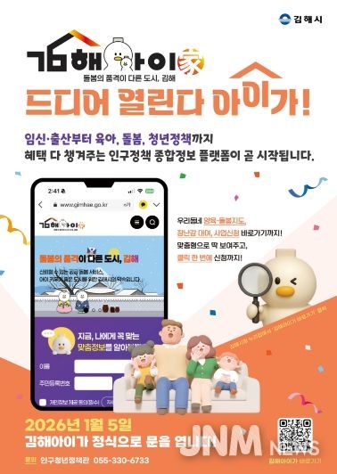 제이앤엠뉴스 | 김해시는 시민 누구나 임신부터 출산, 육아, 돌봄, 청소년, 청년 지원정책까지 한눈에 확인하고 신청할 수 있는 인구정책 종합정보 플랫폼‘김해아이가(家)’를 오는 5일 정식 오픈한다고 2일 밝혔다.