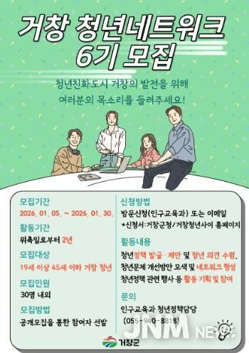 제이앤엠뉴스 | 거창군은 제6기 거창군 청년네트워크 활동가를 오는 5일부터 30일까지 모집한다.
