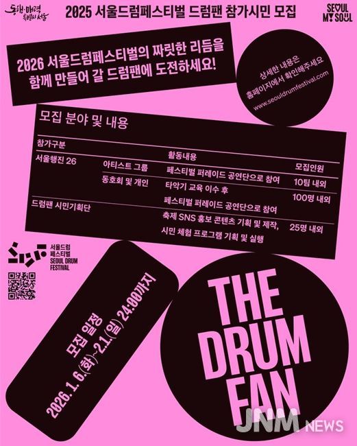 제이앤엠뉴스 | 서울시는 오는 5월 동대문디자인플라자(DDP)에서 개최되는 ‘2026 서울드럼페스티벌’을 앞두고 축제의 주인공으로 활약할 ‘드럼팬(Drum Fan)’ 시민 참여자를 2월 1일까지 모집한다. 올해 축제는 단순 관람을 넘어 시민이 직접 기획하고 참여하는 ‘시민 주도형’ 축제가 될 것으로 기대된다.