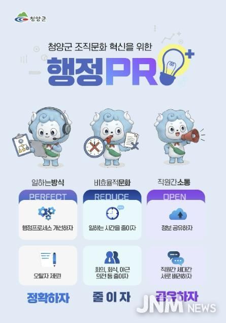 제이앤엠뉴스 | 청양군은 조직문화 혁신과 행정 효율성 제고를 위해 더욱 고도화된 ‘행정PRO+ 운동’을 적극 추진할 계획이라고 16일 밝혔다.