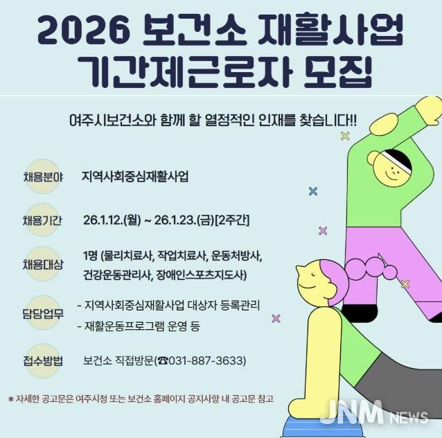 제이앤엠뉴스 | 여주시보건소는 지역 내 등록장애인과 예비장애인들의 건강관리를 위한 지역사회중심재활사업 추진을 위해 1월 12일부터 1월 23일까지 2주간 기간제근로자 채용 공고를 실시한다.