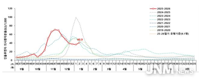 질병관리청에서 운영 중인 표본감시 결과, 의원급 의료기관의 인플루엔자 의사환자 분율은 11월 중순(‘25년 47주차) 이후 감소 추세를 보이다, ’26년 2주차(1.4.~1.10.) 에는 외래환자 1,000명당 40.9명으로 전주(36.4명) 대비 소폭 증가하면서, 이번 절기 유행기준(9.1명)보다 높은 수준으로 유행이 지속되고 있다.