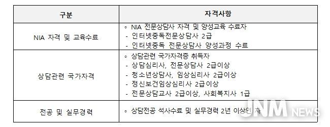 선발 자격은 ▲한국지능정보사회진흥원 시행 인터넷 중독 전문상담사 2급 자격증 소지자 ▲인터넷중독 전문인력 양성교육 이수자 등 관련 자격을 갖춘 인력이다.