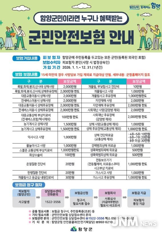 제이앤엠뉴스 | 함양군은 군민들이 일상생활 속 각종 재난·사고로부터 보다 안전하게 보호받을 수 있도록 전 군민을 대상으로 한 ‘2026년 군민안전보험’에 가입해 운영한다고 밝혔다.