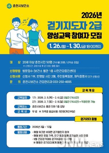 제이앤엠뉴스 | 춘천시보건소가 시민의 걷기 실천 역량을 높이고 지역사회 중심의 걷기문화를 확산하기 위해 ‘2026년 걷기지도자 2급 양성 교육’ 참여자를 모집한다.