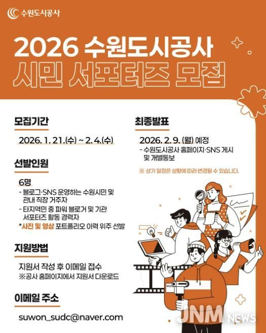 제이앤엠뉴스 | 수원도시공사가 21일부터 다음 달 4일까지 2026년도 제8기 시민 서포터즈를 모집한다.
