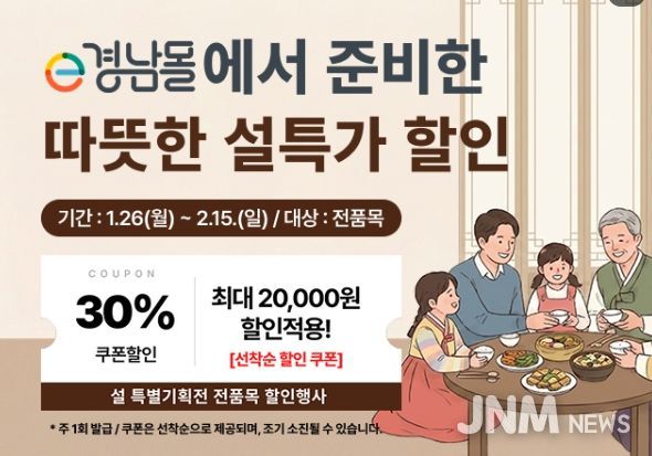 제이앤엠뉴스 | 경상남도와 (재)경상남도투자경제진흥원이 운영하는 e경남몰은 1월 26일부터 예산 소진 시까지 ‘2026년 풍성한 설맞이 할인 기획전’을 진행한다.