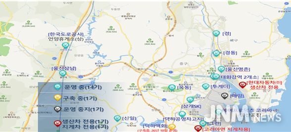 한편 울산시는 수소차 친화 도시 구현을 위해 전국 최대 규모의 수소 배관망을 기반으로 지난 2009년부터 수소전기차 충전소 구축에 나서 덕하공영차고지 수소충전소를 시작으로 태화강역 수소충전소까지 현재 총 16개소의 수소충전소를 구축・운영 중이다.
