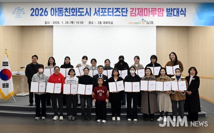 제이앤엠뉴스 | 김제시는 2026년 제3대 아동친화도시 서포터즈단 ‘김제마루맘’ 발대식을 29일 오전 개최했다고 밝혔다. 이날 행사는 정성주 시장과 선발된 김제마루맘 단원, 관계자 등 25여 명이 참석했다.