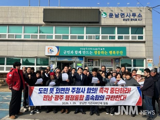 제이앤엠뉴스 | 무안군 각 읍면 기관사회단체협의회는 29일 전남·광주 행정통합 추진과 관련해 최근 합의 내용에 대한 규탄 성명서를 발표했다.