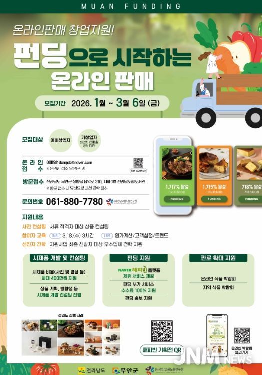제이앤엠뉴스 | 무안군은 지역산업 맞춤형 일자리 창출의 일환으로 ‘펀딩을 통한 상품개발 및 판매경험(식품) 창업 지원사업’ 참여자를 오는 3월 6일까지 모집한다고 밝혔다.