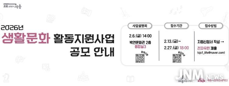 제이앤엠뉴스 | 세종시문화관광재단은 일상 속 시민 주도 생활문화 확산과 지역공동체 의식 강화를 위해 2026년 생활문화 활동지원사업 공모를 진행한다.