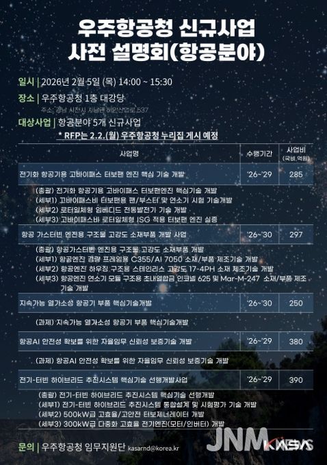 제이앤엠뉴스 | 우주항공청은 2월 5일 오후 2시, 사천 우주항공청 1층 대강당에서 2026년 항공분야 신규사업의 주요 내용을 공유하고, 산·학·연 연구자의 적극적인 참여와 심도 있는 이해를 돕기 위한 사전설명회를 개최한다고 밝혔다.