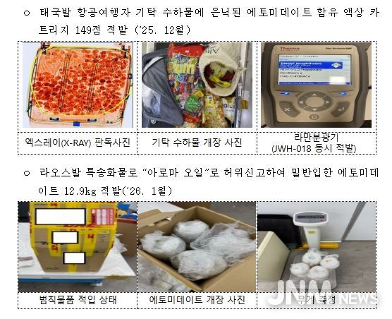 최근 관세청은 태국발 항공여행자의 기탁수하물에서 에토미데이트 성분이 함유된 액상 카트리지 149점을 적발했고, 라오스발 특송화물에서도 아로마오일로 위장한 에토미데이트를 잇따라 적발했다고 밝혔다.