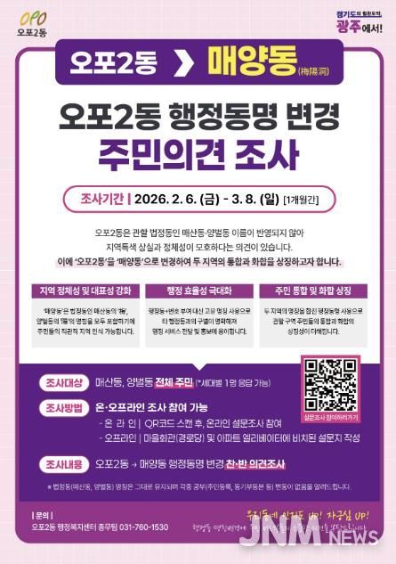 제이앤엠뉴스 | 광주시 오포2동은 지역 정체성을 반영한 행정동 명칭 변경을 위해 2월 6일부터 3월 8일까지 오포2동 전 세대를 대상으로 주민 의견 조사를 실시한다고 4일 밝혔다.