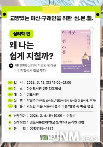제이앤엠뉴스 | 김포시 마산도서관은 심리적 피로와 번아웃을 주제로 한 인문교양 강연 '왜 나는 쉽게 지칠까?'를 오는 3월 12일 오후 7시부터 9시까지 마산도서관 3층 다목적실에서 운영한다.