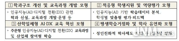 각 참여 대학은 지역 산업과 대학별 강점을 결합한 ‘인공지능(AI)·디지털 전환(DX) 특화 모형’을 구축한다. 대학별로 ▲학과구조 개선, ▲데이터 기반 학생 지원, ▲산학협력 교육, ▲학사제도 유연화 등 필요한 모형을 자유롭게 선택할 수 있다. 또한, 경진대회·공모전 개최로 우수 사례를 발굴·공유하면서, 전문대학 전반의 인공지능(AI)·디지털 전환(DX)을 이끌어갈 계획이다.
