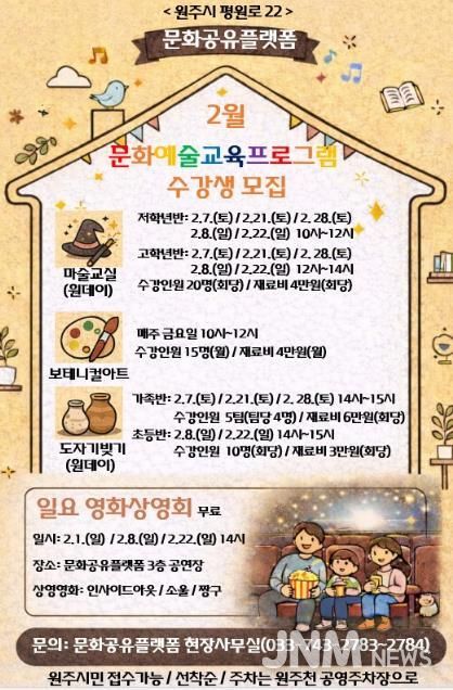제이앤엠뉴스 | 원주시 문화공유플랫폼이 2월 문화예술 교육프로그램 수강생을 모집한다.