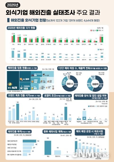 농림축산식품부와 한국농수산식품유통공사가 발표한 '2025년 외식기업 해외진출 실태조사'에 따르면, 국내 외식기업들은 미국, 중국, 베트남 등 전 세계 56개국에 진출하여 4,644개의 매장을 운영하며 글로벌 시장에서 상업적 성공사례를 써 내려가고 있다.