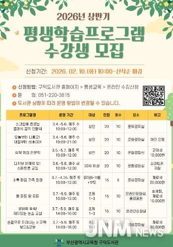 제이앤엠뉴스 | 부산광역시립구덕도서관은 3월부터 5월까지 유아와 성인 140여 명을 대상으로 구덕도서관에서 ‘2026년 상반기 평생학습 프로그램’을 운영한다.