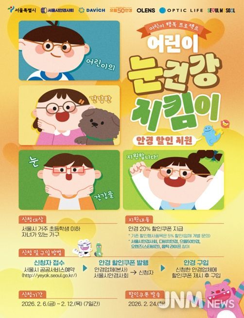 제이앤엠뉴스 | 서울시가 새 학기를 맞아 스마트폰 등 디지털 기기를 자주 접하는 어린이들의 눈 건강을 위해 눈 검진(시력검사)과 최대 20%의 안경 구입 할인을 지원하는 ‘서울 어린이 눈건강 지킴이 사업’ 1차 신청을 받는다.