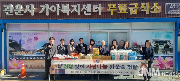 제이앤엠뉴스 | 경상북도성주교육지원청은 2월 6일 설 명절을 맞아 가야복지센터(관운사 무료급식소)를 방문하여 사회복지시설 종사자들의 노고에 감사의 뜻을 전하고 위문품을 직접 전달했다.