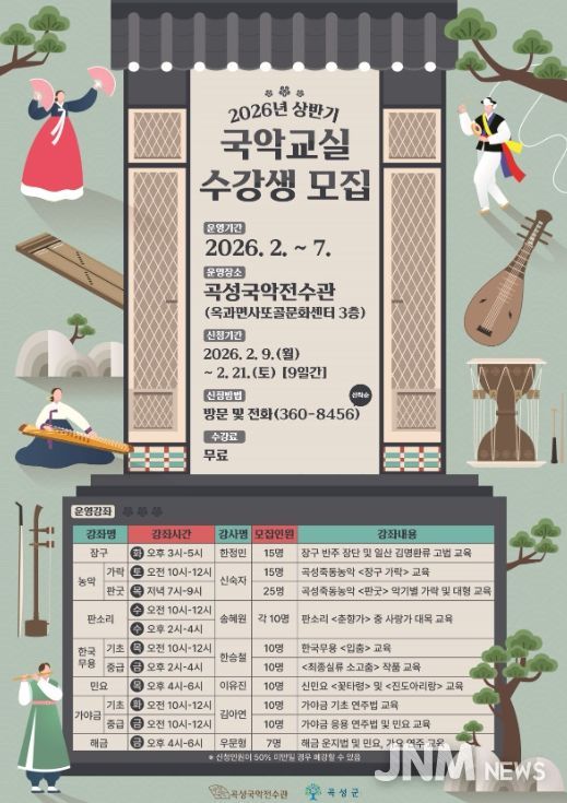 제이앤엠뉴스 | 전남 곡성군은 곡성국악전수관에서 운영하는‘2026년 상반기 국악교실’수강생을 모집한다고 6일 밝혔다.