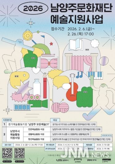 제이앤엠뉴스 | 남양주시는 6일 남양주문화재단이 지역 예술인의 안정적인 창작 환경 조성과 시민 문화향유 기회 확대를 위해 ‘2026년 예술활동 지원사업 공모’를 추진하고, 오는 26일까지 접수를 진행한다고 밝혔다.