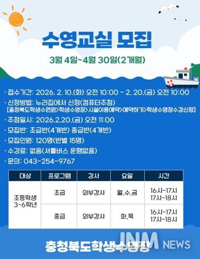 제이앤엠뉴스 | 충청북도교육청 직속기관 학생수련원은 3월 4일부터 4월 30일까지 충북학생수영장에서 초등학교 3~6학년 학생 120명을 대상으로 무료 맞춤형 학생 수영교실을 운영한다고 밝혔다.