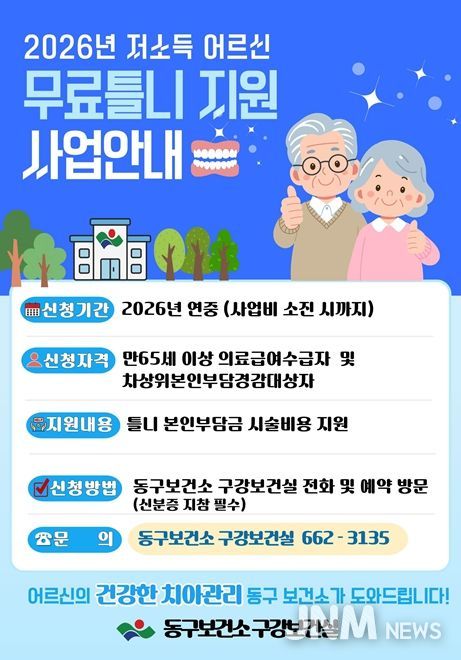 윤석준 동구청장은 “치아 결손으로 불편을 겪는 어르신들이 건강하고 안정적인 노후를 보낼 수 있도록 지속적인 구강보건 지원을 이어가겠다”고 말했다.