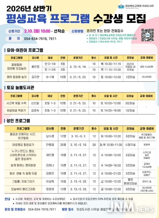 제이앤엠뉴스 | 경상북도교육청 의성도서관은 지역주민의 평생학습 기회를 확대하고 삶의 질 향상을 도모하기 위해 2월 10일(화)부터 상반기 평생교육 프로그램 수강생을 모집한다고 밝혔다.