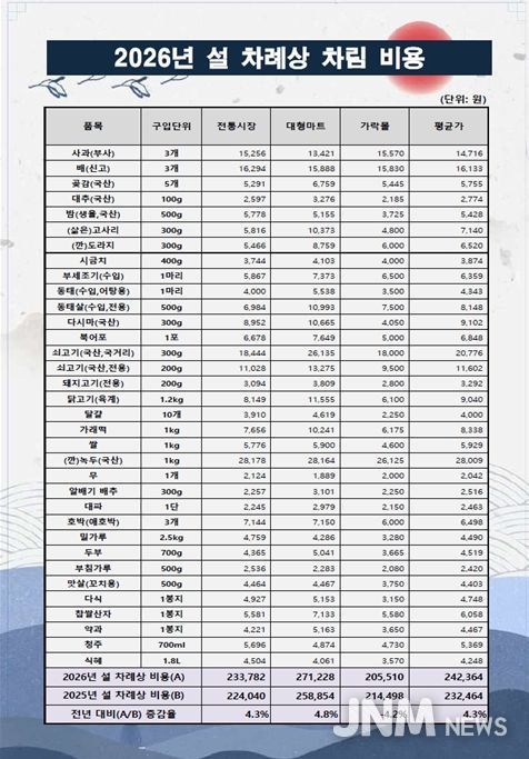 공사는 명절(설·추석) 차례상 차림에 수요가 높은 주요 성수품 34개 품목(6~7인 가족 기준)의 구매비용을 조사해 매년 발표하고 있으며, 금년도 조사 결과 올해 전통시장 구매비용은 233,782원, 대형마트 구매비용은 271,228원으로 전년 대비 각각 4.3%, 4.8% 상승했다.
