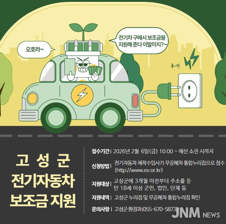제이앤엠뉴스 | 고성군은 대기질을 개선하고 미세먼지 및 기후·생태계 변화 유발물질을 줄이기 위해 2026년 전기자동차 보급사업을 추진한다고 밝혔다.