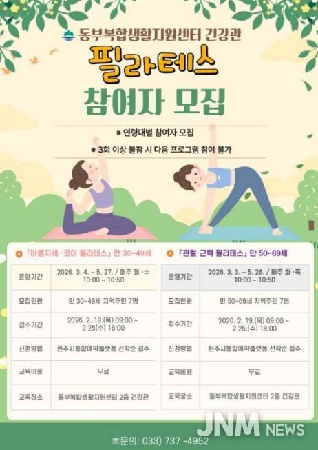 제이앤엠뉴스 | 원주시 동부복합생활지원센터 건강관은 오는 19일부터 중·장년을 대상으로 한 필라테스 프로그램 참여자를 모집한다.