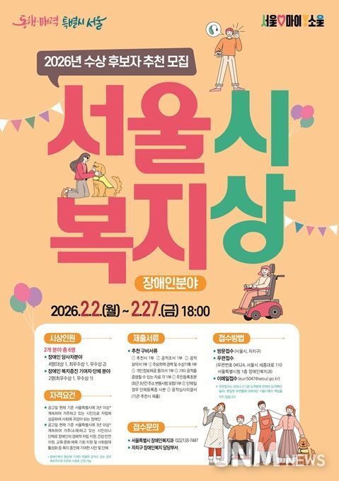 제이앤엠뉴스 | 서울시가 27일까지 ‘2026년 서울시 복지상(장애인분야)’ 수상 후보자를 모집한다.