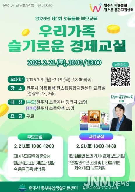 제이앤엠뉴스 | 원주시 아동돌봄 원스톱통합지원센터는 2월 21일 초등생 가족을 위한 무료 경제 교육인'우리 가족 슬기로운 경제 교실'을 운영한다.
