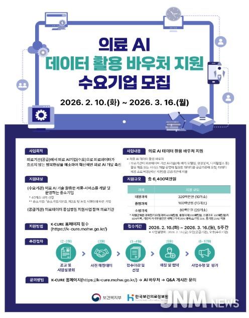 제이앤엠뉴스 | 보건복지부와 한국보건의료정보원(원장 염민섭)은 안전한 의료데이터 활용 촉진을 위해 2월 10일부터 3월 16일까지'의료 AI 데이터 활용 바우처 지원사업'에 참여할 수요기업을 모집한다고 밝혔다.