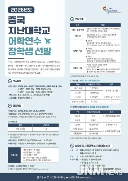 제이앤엠뉴스 | 수원특례시는 2월 20일까지 ‘2026년도 지난대학교 어학연수 장학생 프로그램’ 참가자 1명을 모집한다.