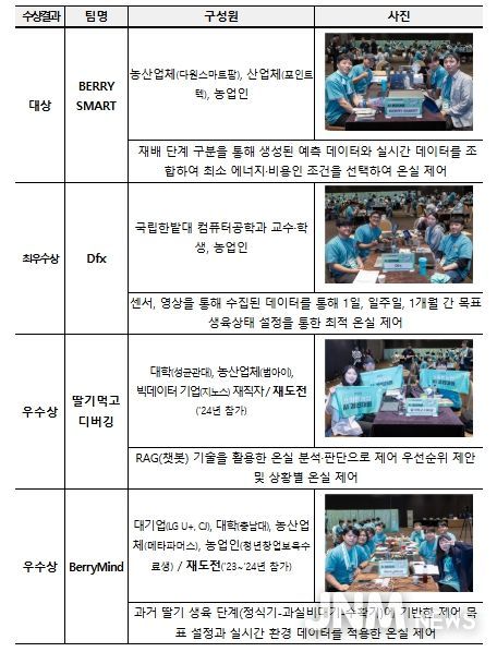아울러 우수상을 수상한 "딸기먹고 디버깅"은 챗봇 기술을 활용한 상황별 제어, "BerryMind"는 성장단계별 생육데이터에 기반한 실시간 최적화로 눈길을 끌었다.