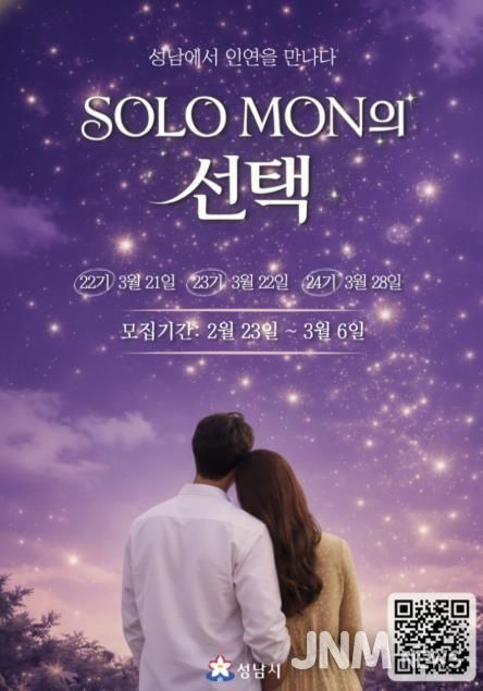 제이앤엠뉴스 | 성남시는 오는 2월 23일부터 3월 6일까지 ‘솔로몬(SOLO MON)의 선택’ 22~24기 행사 참가 희망자 300명(남녀 각 150명)을 모집한다.
