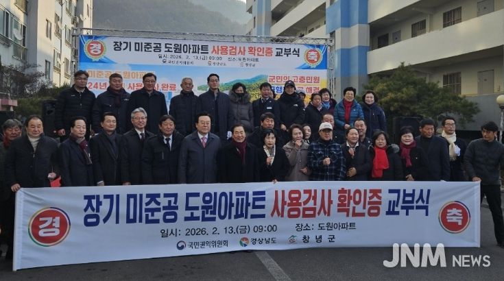 제이앤엠뉴스 | 경상남도는 13일 창녕읍 송현리 53번지 도원아파트에서 아파트 동대표, 국회의원, 창녕군수, 도의원, 군의원, 국민권익위원회 등이 참석한 가운데 ‘장기 미준공 도원아파트 사용검사 확인증 교부식’을 개최했다고 밝혔다.
