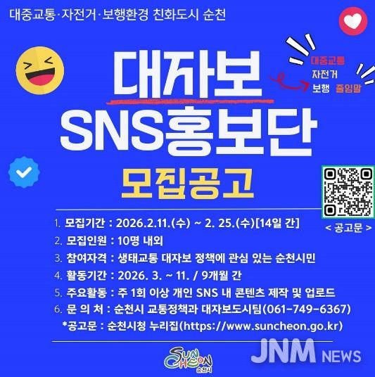제이앤엠뉴스 | 순천시는 생태교통의 일환으로 추진 중인 ‘대자보’ 정책을 시민 눈높이에서 알리고자 '2026년 순천시 대자보 SNS 홍보단'을 모집한다고 밝혔다.