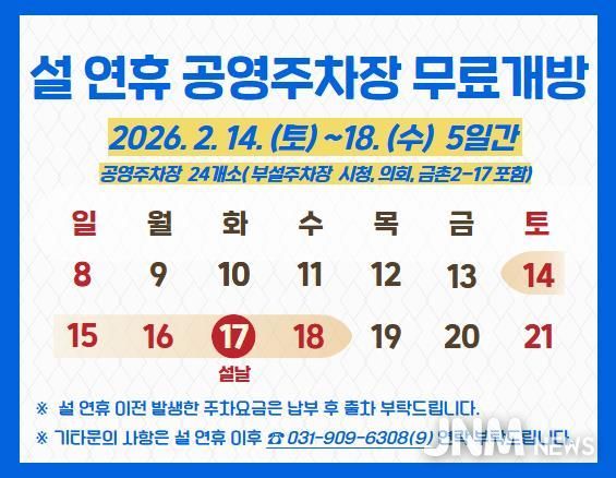 제이앤엠뉴스 | 파주도시관광공사는 12일, 2026년 설 명절을 맞아 시민과 고향을 방문하는 귀성객의 교통편의를 위해 공영주차장 24곳(부설주차장 시청, 의회, 금촌2-17 포함)을 오는 14일(토)부터 18일(수)까지 5일간 무료로 개방한다고 밝혔다.