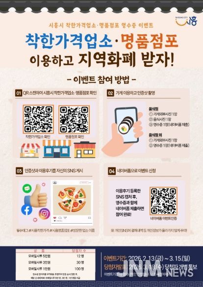제이앤엠뉴스 | 시흥시는 착한가격업소ㆍ명품점포 활성화와 설 명절 지역 물가안정을 위해 ‘2026년 상반기 착한가격업소ㆍ명품점포 방문 이벤트’를 2월 13일부터 3월 15일까지 진행한다.