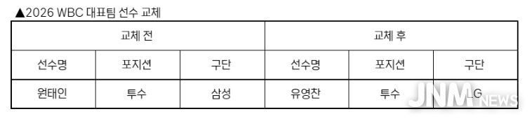 제이앤엠뉴스 | KBO 전력강화위원회는 부상으로 인해 WBC 참가가 어려워진 삼성 원태인을 대체할 선수로 LG 유영찬을 확정하고 WBC 조직위에 선수 교체 승인을 요청했다.